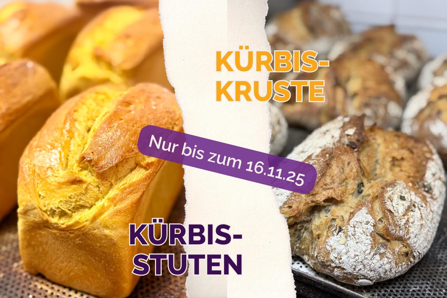Nur noch bis zum 16. November gibt es unsere beliebten Kürbis-Stuten samstags und sonntags sowie die Kürbis-Kruste immer samstags – frisch gebacken, herrlich saftig und mit feiner Kürbisnote.